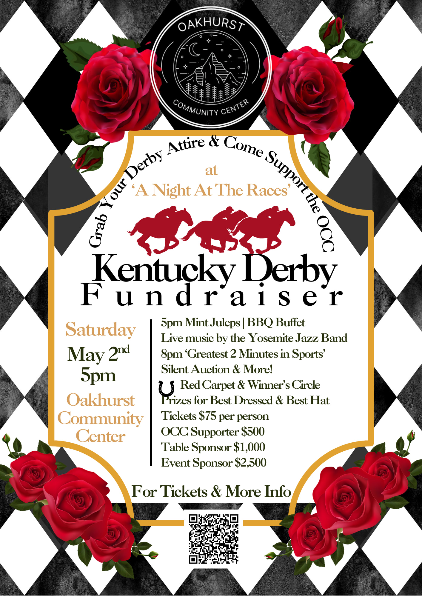 Grab your derby attire and come support the OCC. Mint Julips, BBQ Buffet, Live Music by the Yosemite Jazz Band, Greatest 2 Minutes in Sports, Silent Auction & More! Sponsorship Opportunities available.