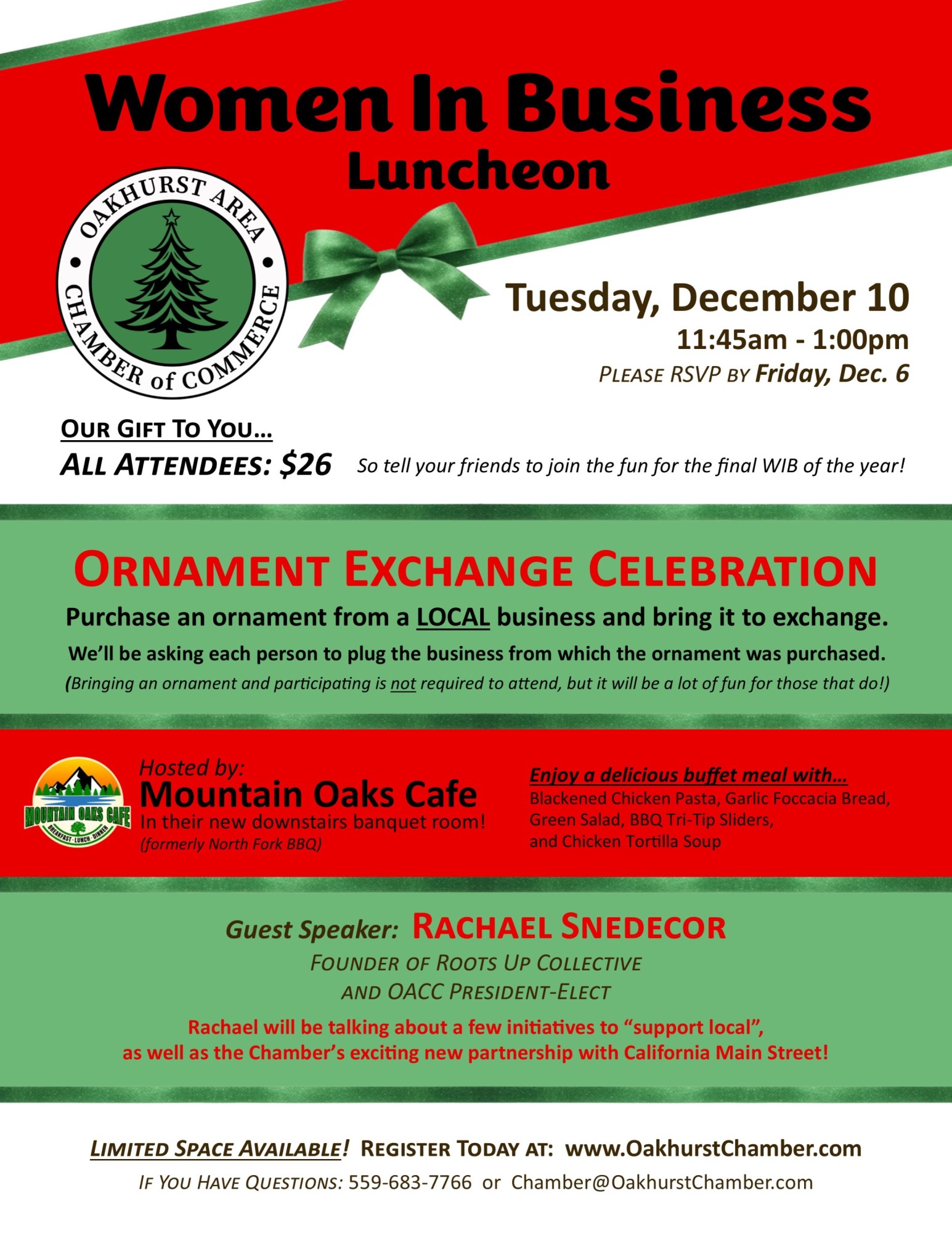 We're excited to announce that December's luncheon will be hosted at Mountain Oaks Cafe, in their downstairs banquet room (previously North Fork BBQ).