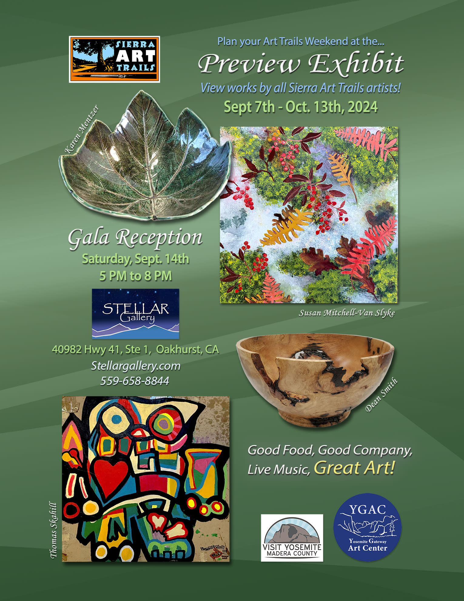 The Gala Reception celebrates the Sierra Art Trails Preview Exhibit, showcasing representative work by all artists participating in the Sierra Art Trails 2024 Open Studio Tour. The reception will feature live music, food and wine available for purchase, and an awards ceremony honoring organizations and individuals who contribute to the creative community.