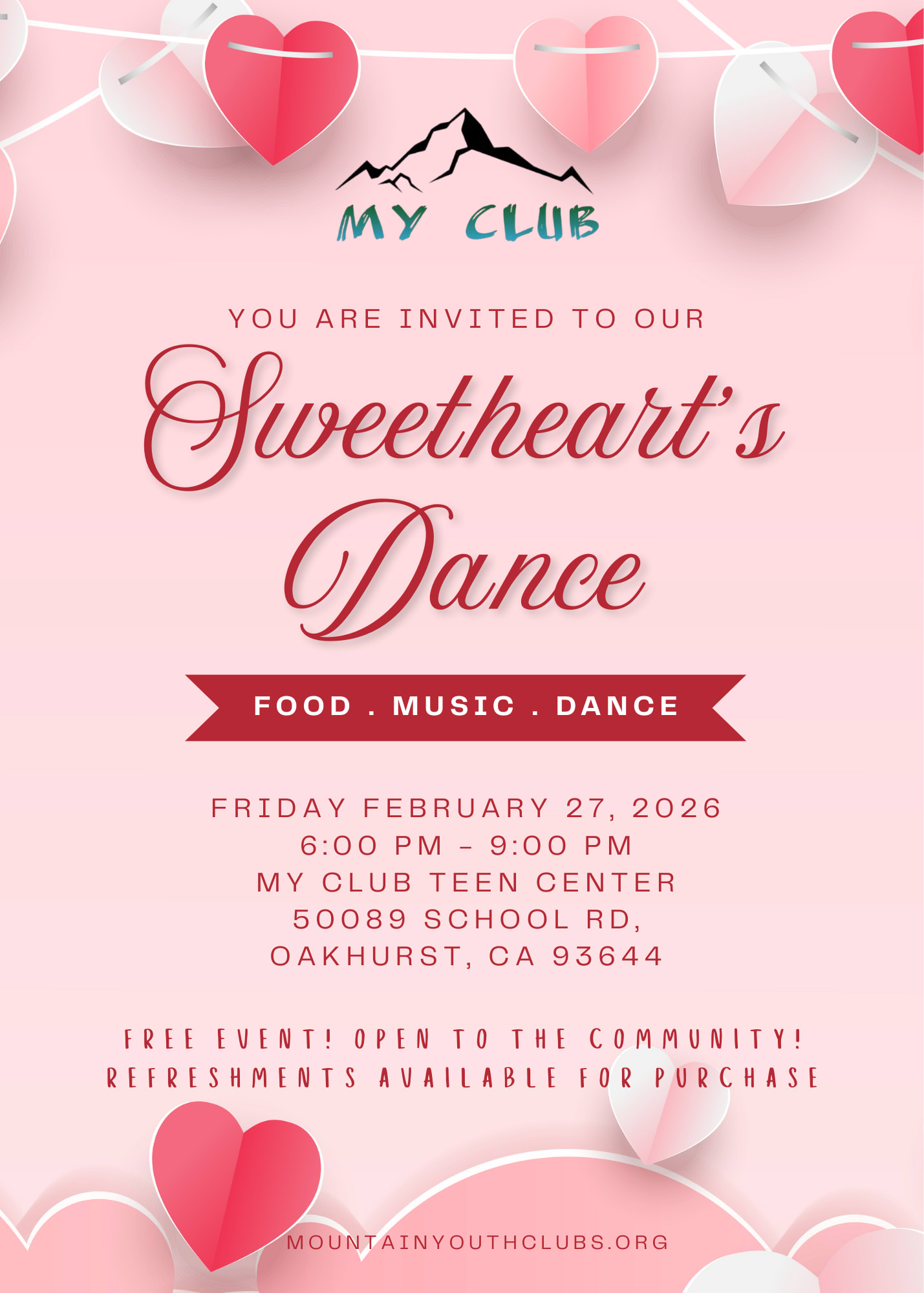 You’re invited to a fun and festive evening at our Sweetheart’s Dance! Bring your sweetheart, friends, or family and enjoy a night filled with music, dancing, and good vibes.